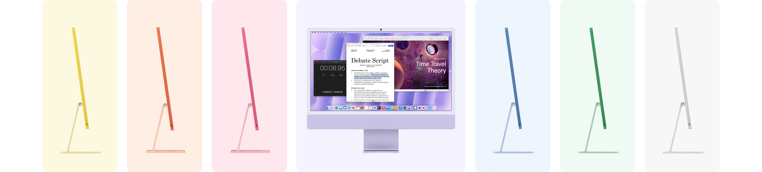 7 iMacs in different colors (Blue, Green, Pink, Silver, Yellow, Orange, Purple) in a accordion arrangement
