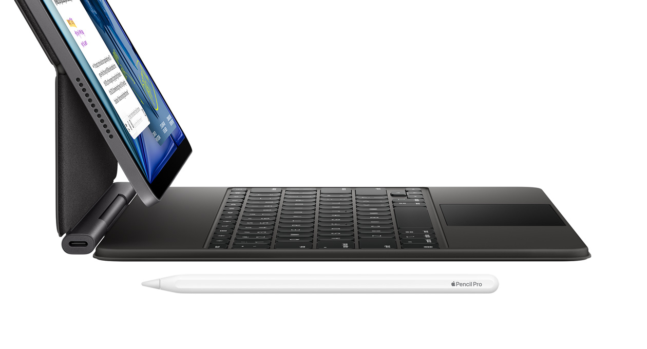 iPad Air s přicvaknutým Magic Keyboardem a Apple Pencilem Pro