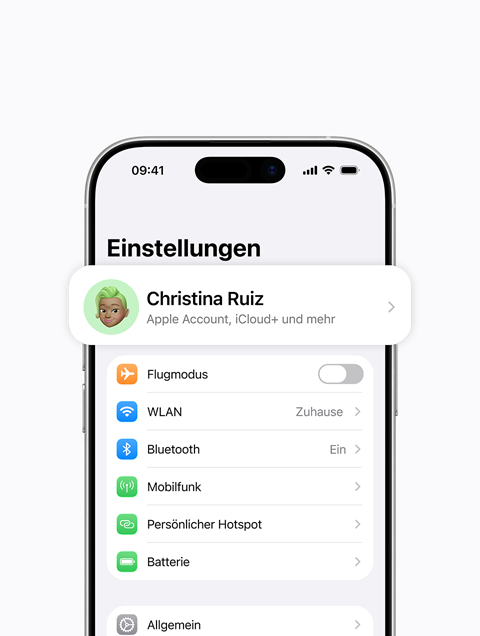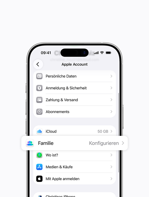Du musst deine Gruppe als Familienorganisator:in einrichten und dann andere Mitglieder einladen, ihr beizutreten. Öffne zuerst „Einstellungen“. Tippe dann auf deinen Namen, dann auf „Familie“ und folge den angezeigten Hinweisen, um Familienmitglieder einzuladen.
