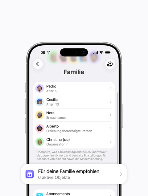 Du kannst Tipps und Vorschläge erhalten, wie du Features für Familien optimal nutzen kannst. Öffne einfach „Einstellungen“, tippe auf deinen Namen, auf „Familie“ und dann auf „Für deine Familie empfohlen“.