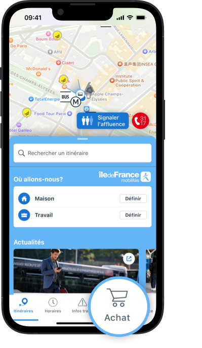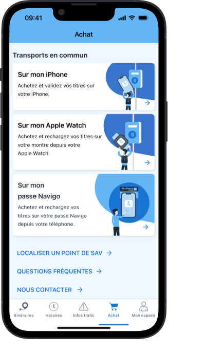 Vous pouvez acheter vos tickets et forfaits Navigo Jour directement dans Cartes. Par ailleurs, les forfaits Navigo Mois et Semaine peuvent également être ajoutés à Cartes via les apps Bonjour RATP, Île-de-France Mobilités ou SNCF Connect, et le passe Navigo Liberté+ via l’app Île-de-France Mobilités. Pour voir la liste complète des titres de transport et forfaits pouvant être utilisés sur votre appareil Apple, rendez-vous sur le site Île‑de‑France Mobilités.