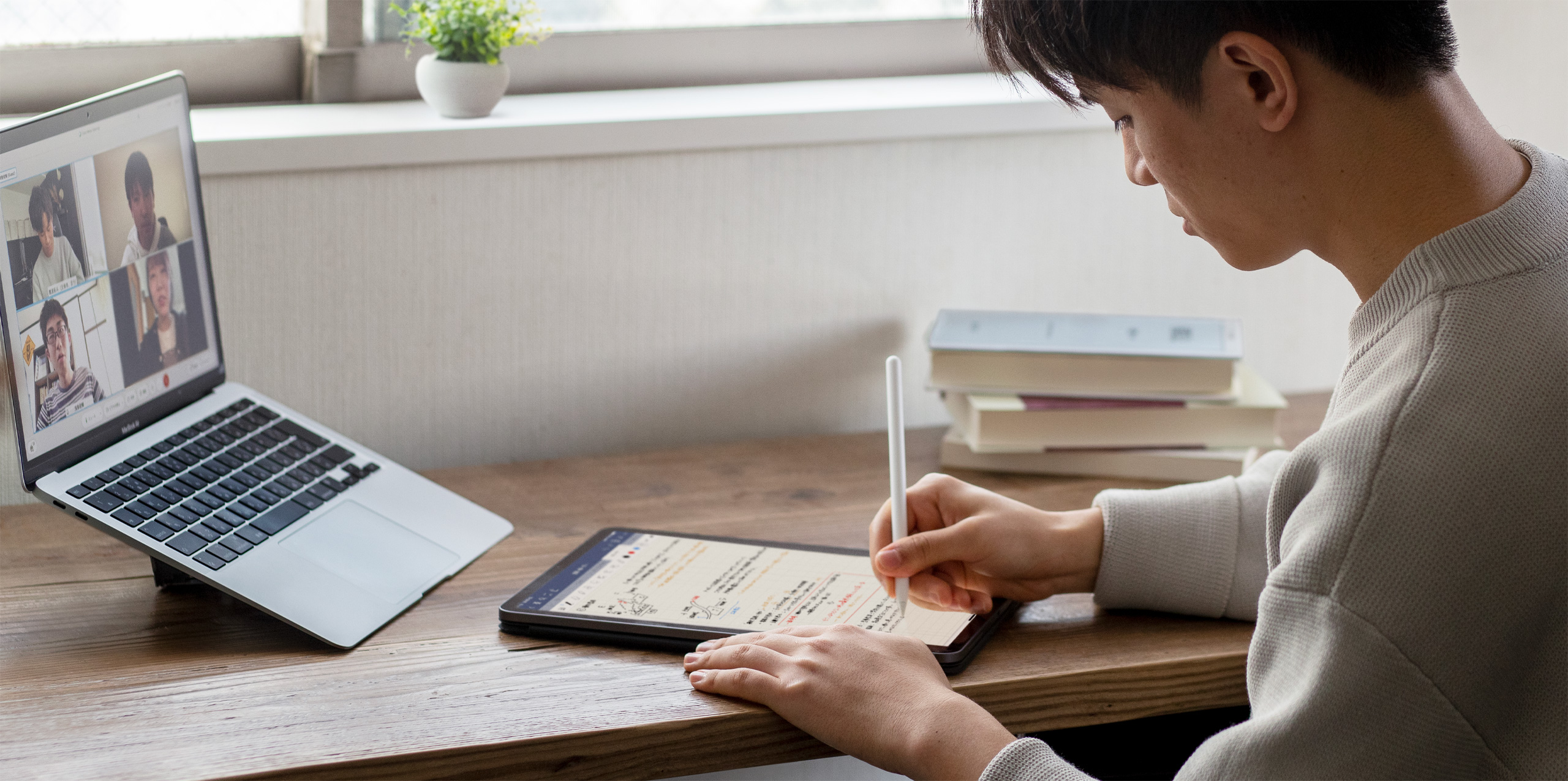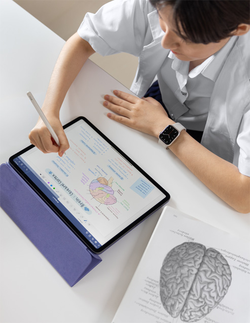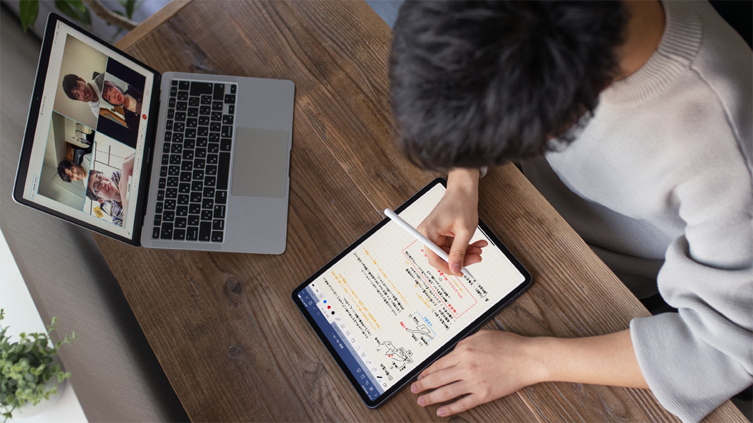 Comme beaucoup de ses pairs, Takuto s’est adapté à l’apprentissage à distance en tirant parti de technologies de pointe. Pendant les cours magistraux en ligne, il utilisait Split Screen sur iPad pour voir, d’un côté, la présentation de l’enseignant ou enseignante, et de l’autre, ses notes griffonnées. Et pour les sessions de groupe virtuelles, Takuto recourait à FaceTime sur Mac pour échanger avec ses camarades de classe tout en profitant de l’espace de dessin immersif de l’iPad pour élaborer les projets de groupe.