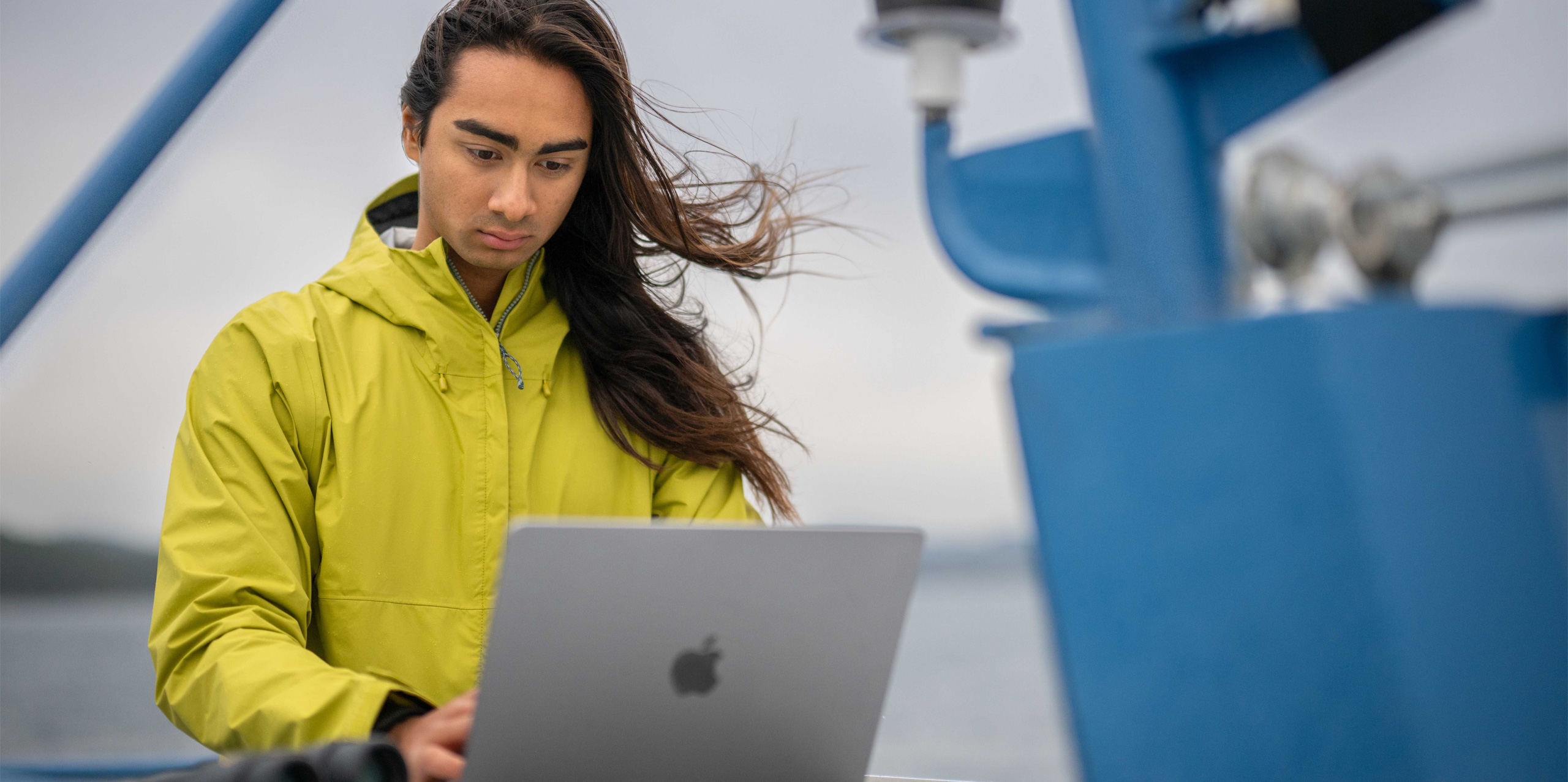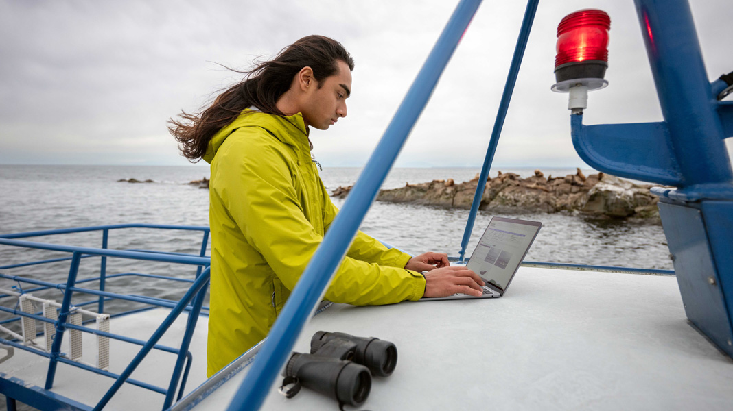 La technologie Apple aide également Bodhi à mener et à synthétiser ses recherches universitaires : par exemple, illustrer les impacts de l’activité des navires sur la population menacée des orques résidentes du Sud, dans la mer des Salish. Muni de son MacBook Air, de son iPhone et de ses jumelles, il aborde le travail de terrain directement sur l’eau. Il cartographie les observations de baleines en utilisant Numbers et Keynote pour créer des organigrammes et des cartes de densité qui montrent les croisements entre les lieux qu’elles fréquentent et les itinéraires de ferry très empruntés, ce qui permet d’identifier une gêne potentielle pour les populations de baleines résidentes. Et avec son iPhone, il prend des photos et tourne des vidéos saisissantes qui documentent ses découvertes.
