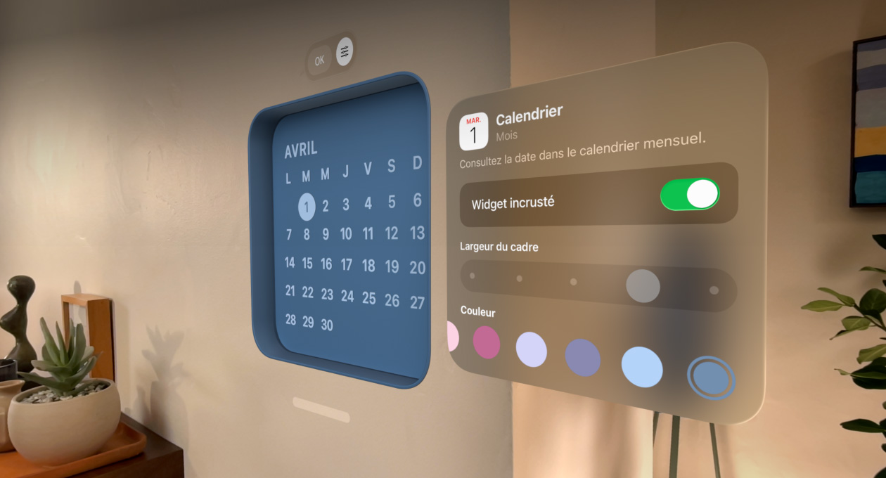 Gardez vos widgets préférés – comme Photos, Horloge, Musique et Calendrier – à portée de vue. Personnalisez l’épaisseur, la couleur et la profondeur de leur cadre pour retrouver un espace bien à vous chaque fois que vous utilisez votre Apple Vision Pro.
