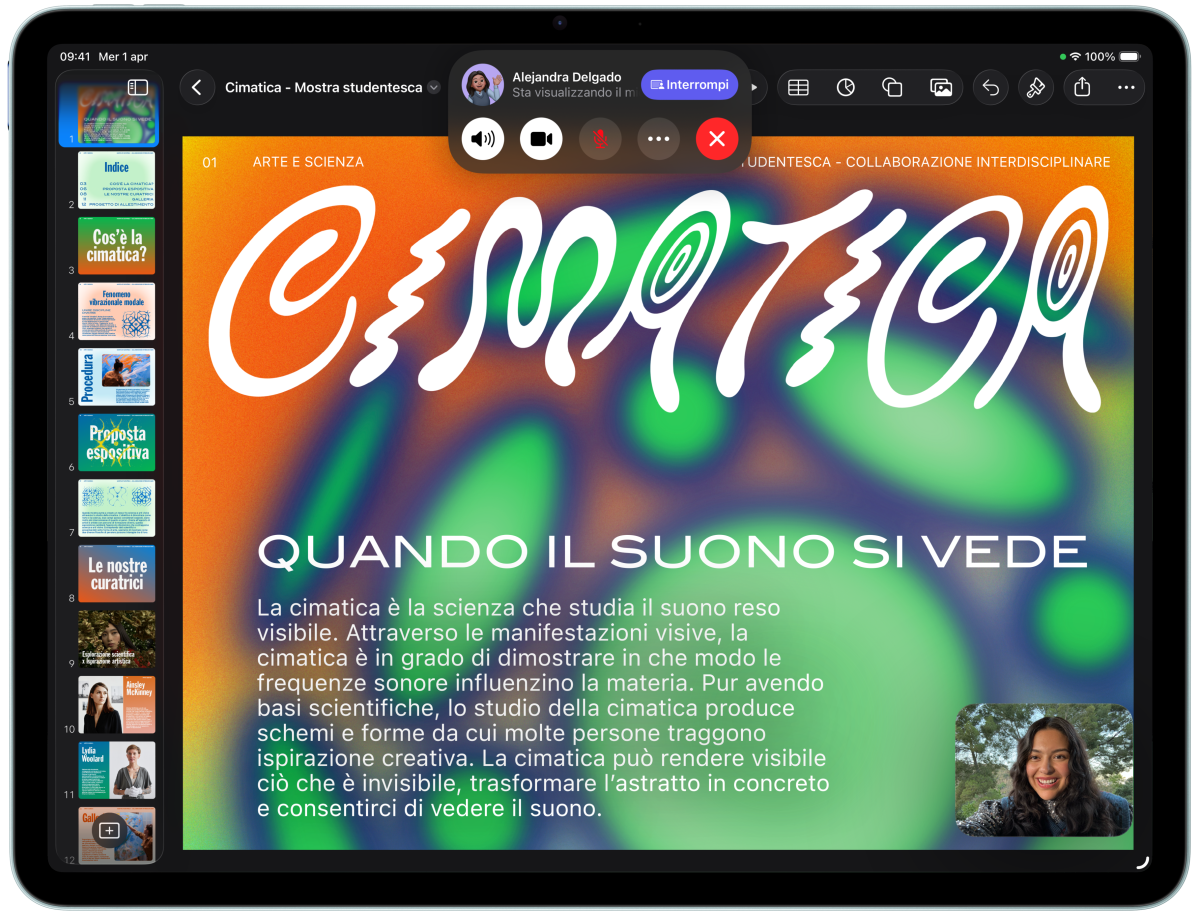 Animazione di un iPad Air mostrato di fronte, sullo schermo c’è una persona che visualizza Keynote durante una chiamata FaceTime. Subito dietro c’è un altro iPad Air mostrato da dietro.