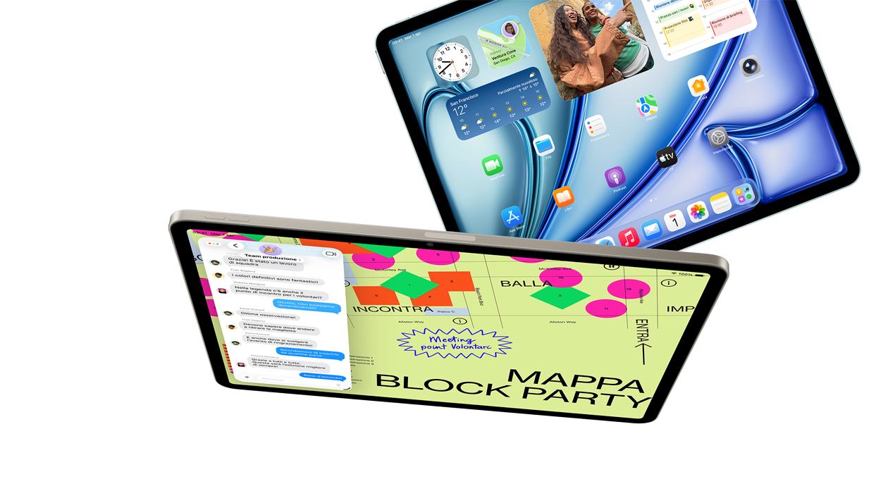 Lo splendido design Liquid Glass dal look sorprendente è solo una delle tante incredibili innovazioni di iPadOS 26 che portano la produttività di iPad Air a un livello mai visto. Il sistema di gestione delle finestre è stato riprogettato per offrirti ancora più flessibilità ed efficienza. Puoi usare app professionali, lanciarti in giochi ad alte prestazioni e affrontare ogni progetto creativo con un’interfaccia immediata, pensata per i gesti touch.