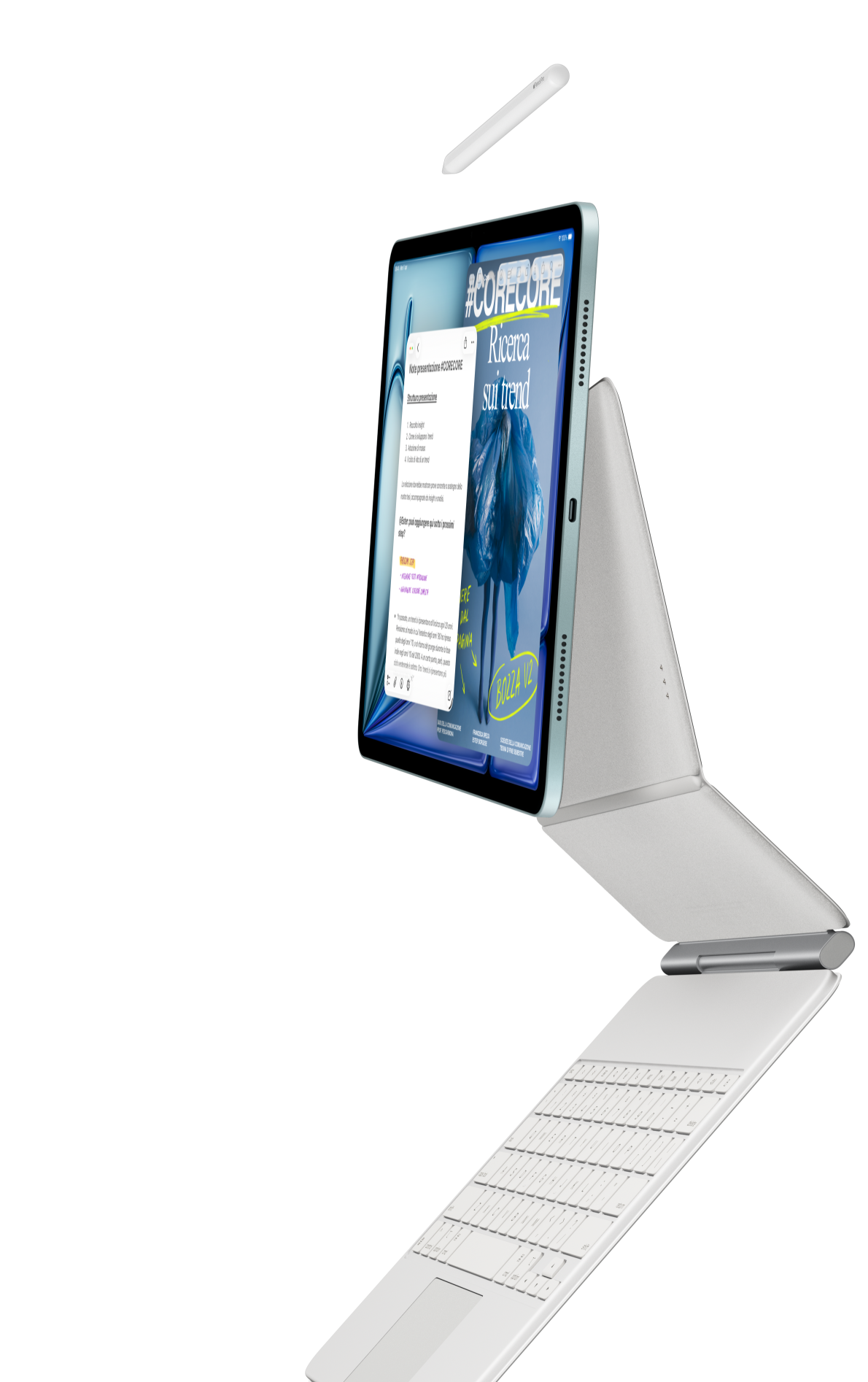 La Magic Keyboard è l’anima gemella di iPad Air. È disponibile in nero o bianco. Elegante e portatile, è comodissima per scrivere e il suo track­pad è perfetto per i lavori che richiedono grande precisione. Ha anche 14 tasti funzione, un connettore USB‑C per la ricarica pass‑through e, quando è chiusa, protegge il tuo iPad Air davanti e dietro. Il design a inclinazione libera ti permette di regolare l’angolazione proprio come vuoi e, grazie all’ampio track­pad in vetro, puoi interagire con iPadOS in modi nuovi.2