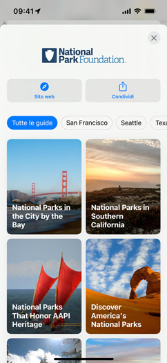 Le guide sono elenchi di luoghi selezionati da partner di fiducia per aiutarti a scoprire ristoranti, negozi, luoghi d’interesse e meraviglie nascoste. Mappe offre oltre 1000 guide per varie città del mondo. In Mappe su iOS 15, tocca “Esplora le guide” per vedere quelle consigliate dalla redazione.