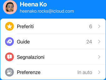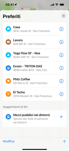 Apri Mappe e tocca la foto del tuo account in basso sullo schermo per vedere in un unico posto le impostazioni che usi di più, come il mezzo di trasporto che prendi abitualmente, i problemi che hai segnalato, i tuoi posti preferiti e molto altro. E quando apri Mappe sui tuoi dispositivi o sul display della tua macchina con CarPlay, vedi subito i posti in cui vai più spesso. Così casa, lavoro, palestra, la scuola dei tuoi figli, la stazione di servizio più vicina o il tuo ristorante preferito distano sempre un solo tap da te.
