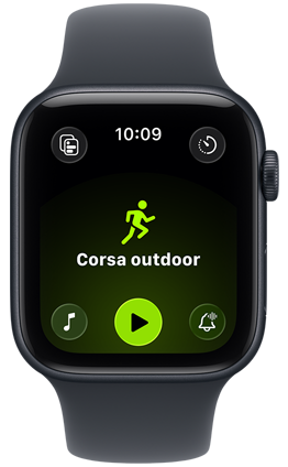 Esplora gli Apple Watch Tre modelli di Apple Watch: al centro cassa color naturale, quadrante con corsa e statistiche della frequenza cardiaca; a destra cassa Jet Black, quadrante con Genmoji; a sinistra cassa color oro rosa, quadrante con app Parametri Vitali