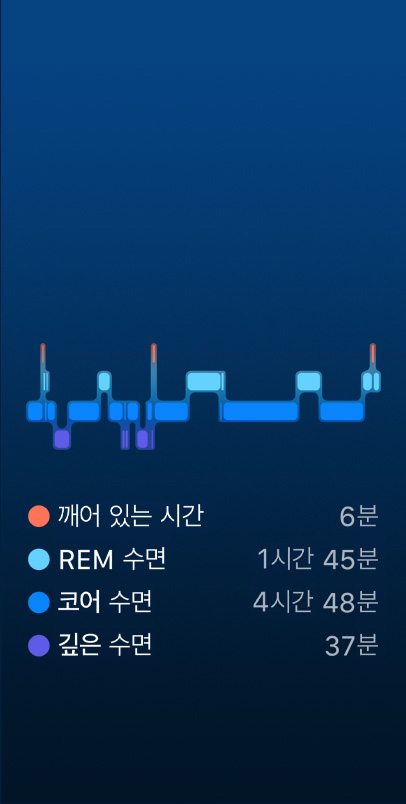 매일매일의 건강 상태를 손목에서 바로 이해할 수 있습니다. Apple Watch를 착용하고 수면을 취하면 평균 심박수, 호흡수, 혈중 산소 농도,7