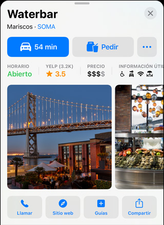Al elegir un destino, la tarjeta interactiva te mostrará al instante todo lo que necesitas saber acerca del lugar, como la dirección, los horarios, el sitio web y el número de teléfono. También puedes consultar detalles como rangos de precios, fotos, métodos de pago aceptados e incluso si puedes llevar a tu perro.