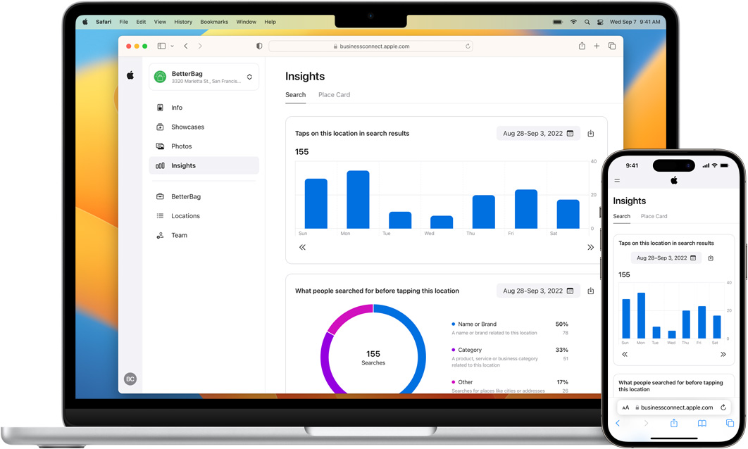 Dane od Apple podpowiadają, jak klienci znajdują i wykorzystują Twoje wizytówki, przedstawione oferty i czynności. Dzięki temu możesz wprowadzać zmiany, żeby poprawiać wyniki.