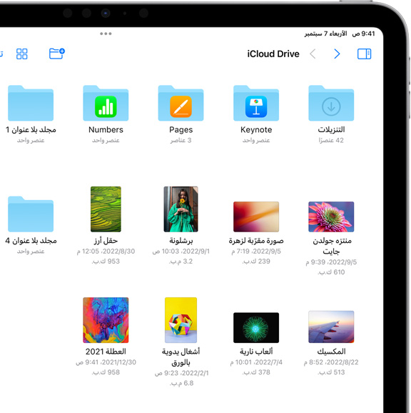 iCloud Drive يمكّنك من رؤية الملفات والمجلدات المخزنة ومشاركتها، أياً كان الجهاز الذي تستخدمه. ويمكنك الوصول إليها من تطبيق الملفات في iOS وiPadOS، أو من فايندر على جهازك Mac، أو من File Explorer على أجهزة Windows PC، أو على iCloud.com.