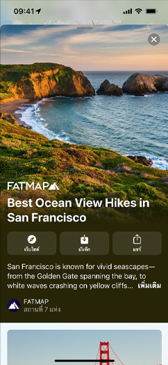 "สถานที่น่าสนใจที่ คัดสรรมาอย่างดี" คือ รายชื่อ สถานที่ที่จัดทำขึ้นโดย พันธมิตร ที่เชื่อถือได้ เพื่อช่วย ให้คุณ ได้ค้นพบ สถานที่ดีๆ สำหรับการกิน ช้อปปิ้ง พบปะเพื่อนฝูง หรือเพียงเพื่อ การสำรวจ แอปแผนที่ มีสถานที่ น่าสนใจ ที่คัดสรร มาอย่างดี กว่า 1,000 รายการ ในเมืองต่างๆ ทั่วโลก แตะ "สำรวจ สถานที่ น่าสนใจ" บนแอปแผนที่ใน iOS 15 เพื่อดู สถานที่น่าสนใจที่แนะนำโดยบรรณาธิการ แอปแผนที่ -