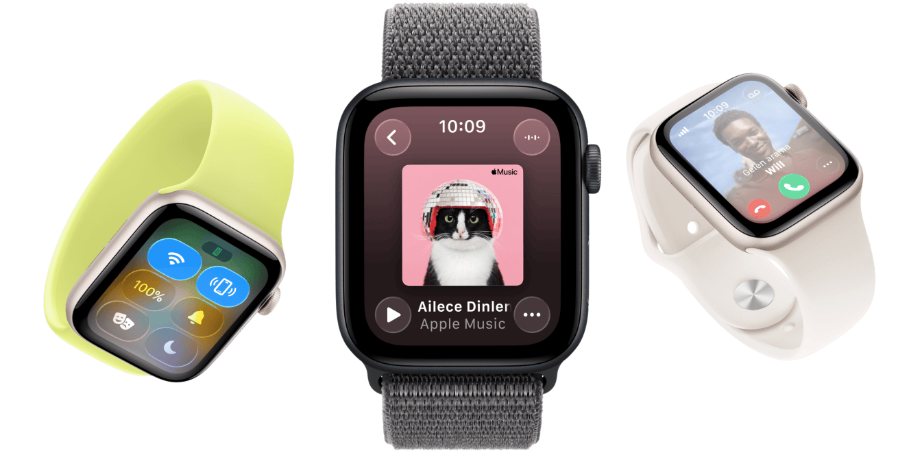 Apple Watch SE 3 aygıtları, alüminyum kasalar, yıldız ışığı ve gece yarısı renkleri, Spor Loop, koyu gri renk, Solo Loop, bulut pembesi renk, Solo Loop, demir mavisi renk, ekranlar: Apple Music, gelen arama, Mesajlar