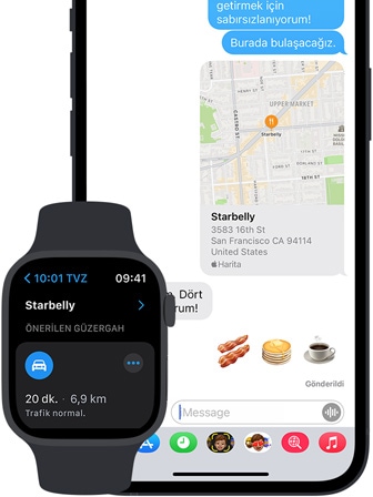Bir yerden bir yere giderken, kullandığınız tüm Apple aygıtlarında kusursuz ve kesintisiz bir deneyimin tadını çıkarın. Apple Watch’taki Dokunsal Geri Bildirim özelliği küçük bir dokunuşla gitmeniz gereken doğru yönü bildiriyor. Böylece sürekli iPhone’unuzu çıkarmanıza gerek kalmıyor. Mac’inizdeki takvim uyarıları, çalışmayı bırakıp yola çıkmanız gerektiğinde size haber veriyor. Ve Harita size doğru zamanda doğru bilgiyi sunabilmek için Siri, Spotlight, Mesajlar ve Hava Durumu ile otomatik olarak eşzamanlanıyor.