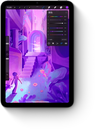 使用者手握 Apple Pencil Pro,在 iPad mini 上創作出多彩的插圖。