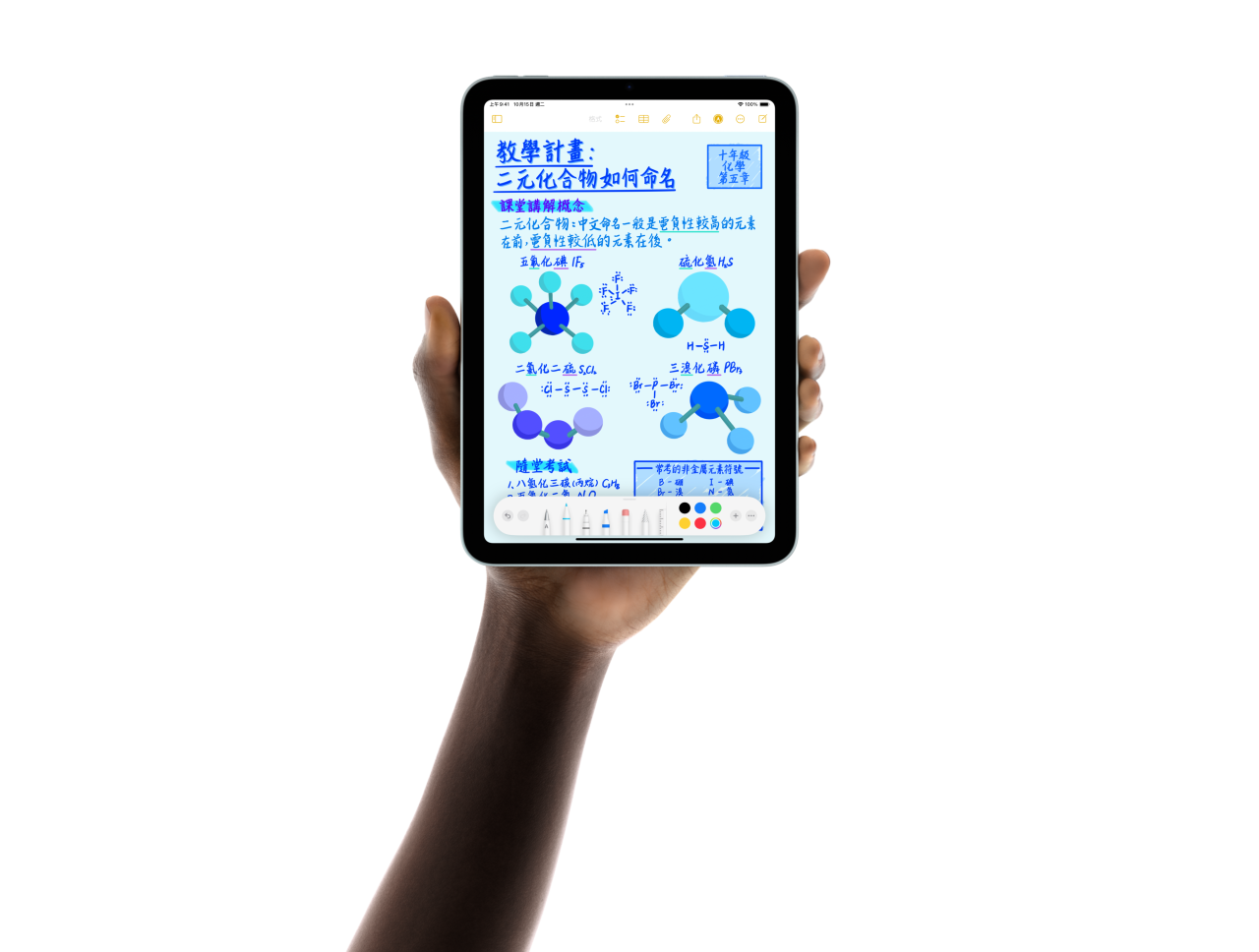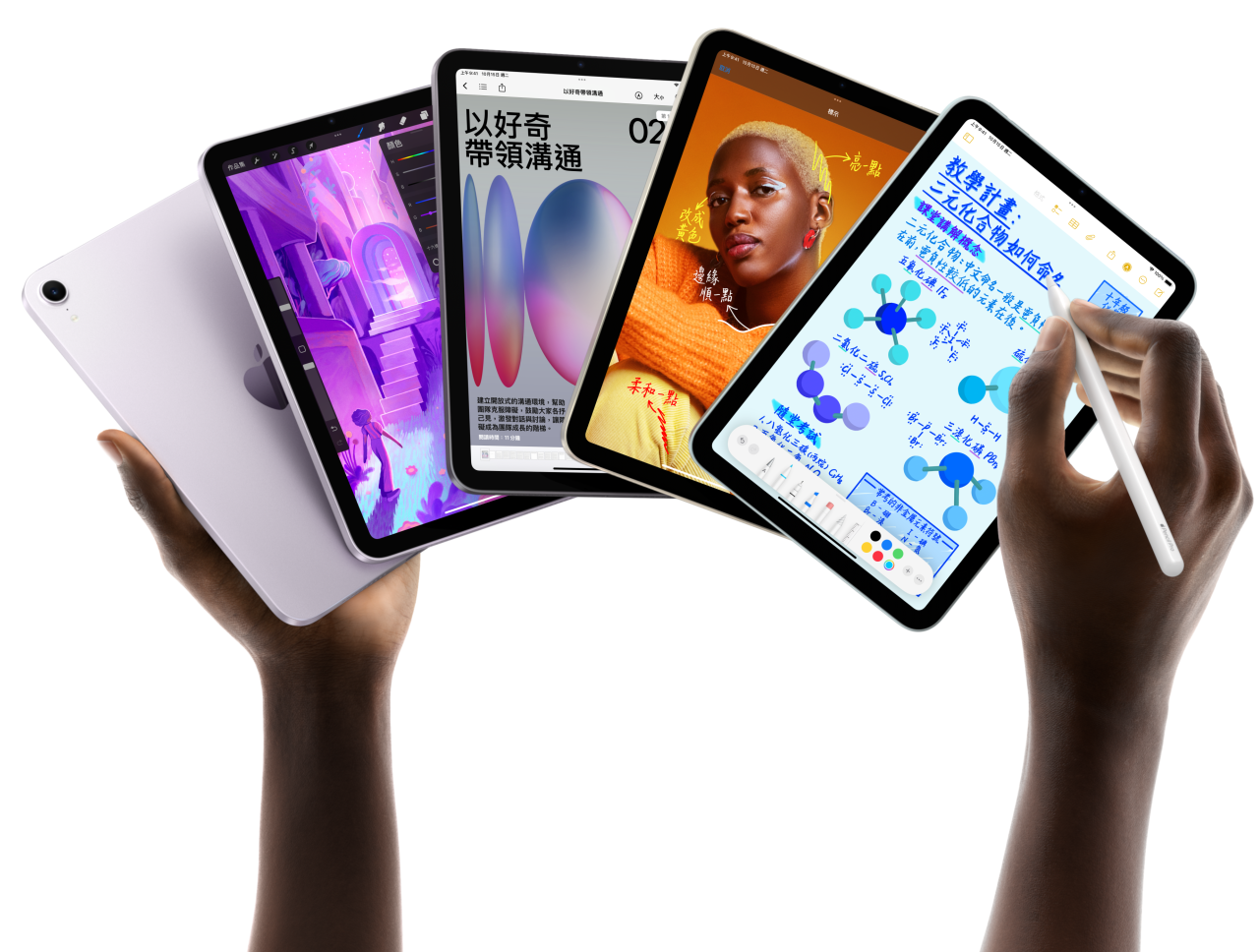 使用者手中拿著五款 iPad mini 機型,呈扇形排列。一部機型展示後置相機,其他四部則正面朝前排列。正在使用 Apple Pencil Pro 做筆記。
