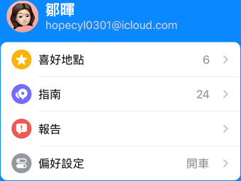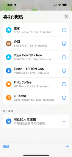 打開「地圖」並輕點畫面底部的使用者帳號照片,即可查看偏好的大眾運輸方式、喜好項目等,最常用的設定都集中在這裡。當你使用 CarPlay 在裝置上或儀表板上打開「地圖」時,它會顯示你最常去的地點,無論是住家、辦公室、健身房、孩子的學校、最近的加油站或是你最喜歡的餐廳,只要輕點一下就能帶你去。