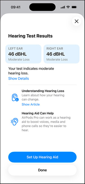 Immediate results. Seamless support. When you complete the test, you see a personalised profile with easy‑to‑understand results and insights about your hearing. If you have little to no loss, but could still benefit from hearing certain frequencies more clearly, you’ll be able to adjust your Media Assist settings for enhanced audio on media and calls. And if you have perceived mild to moderate hearing loss, you’ll be prompted to set up the Hearing Aid feature.
