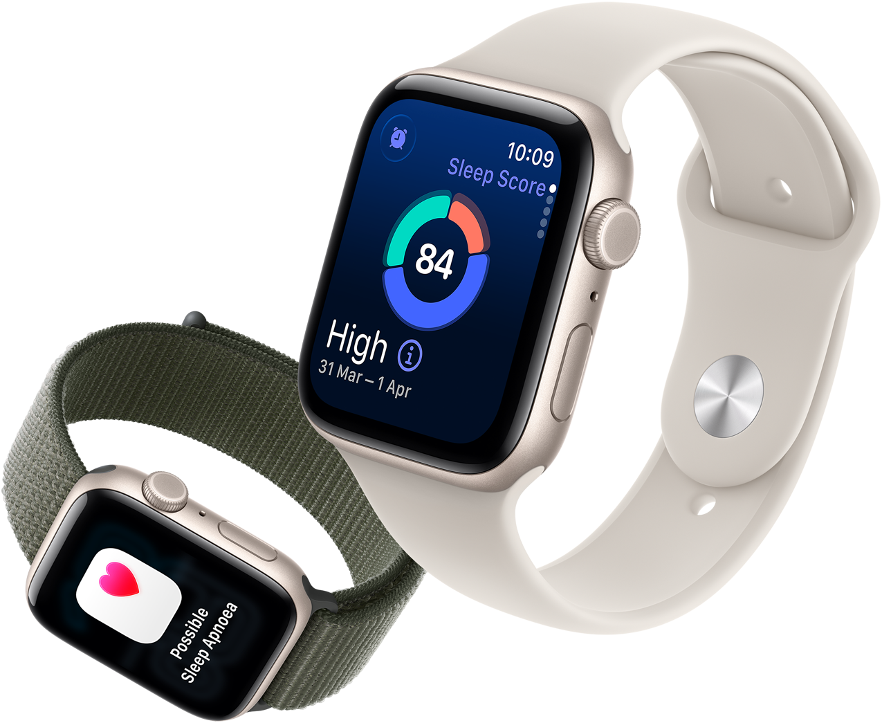 Apple Watch SE 3 devices, aluminium cases, starlight and midnight colours, screens: Vitals app, Heart Rate app, Sleep Score, Activity rings, incoming call