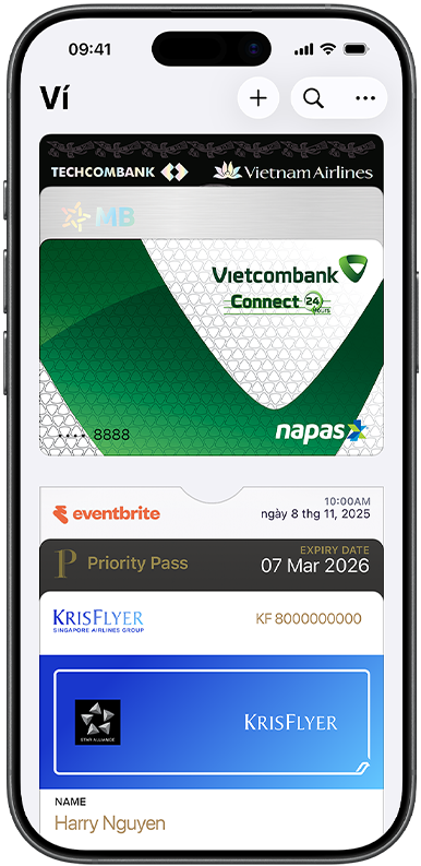Thiết lập trong nháy mắt. Ngay trên iPhone của bạn. Apple Pay được tích hợp sẵn trong iPhone, Apple Watch, máy Mac và iPad. Để bắt đầu trên iPhone, mở ứng dụng Ví và chạm vào biểu tượng dấu cộng. Bạn sẽ có tùy chọn thêm thẻ vào các thiết bị khác của mình cùng một lúc. Khi bạn muốn thanh toán, chỉ cần nhấn đúp, chạm, và thế là xong. Bạn vẫn nhận được điểm thưởng và lợi ích từ thẻ của mình, nhờ đó bạn sẽ không bỏ lỡ bất kỳ điểm thưởng hay dặm thưởng nào.